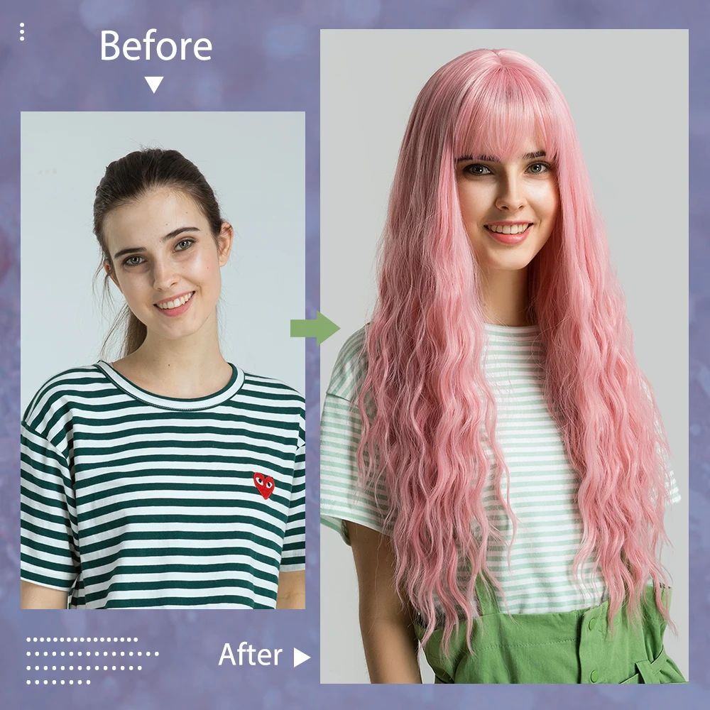 Inhaircube Pink Womens Wigs with Bangs Synthetic Long Hair Curly Mid Part Lolita Descendants Natura
