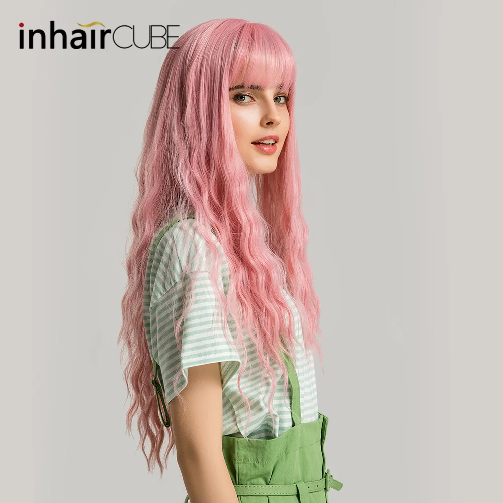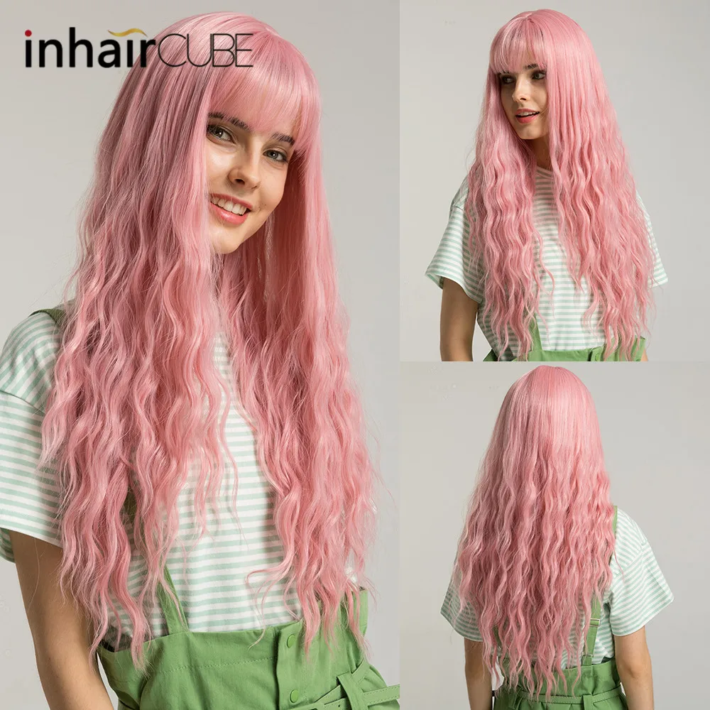 BEST Inhaircube Pink Womens Wigs with Bangs Synthetic Long Hair Curly Mid Part Lolita Descendants Natura