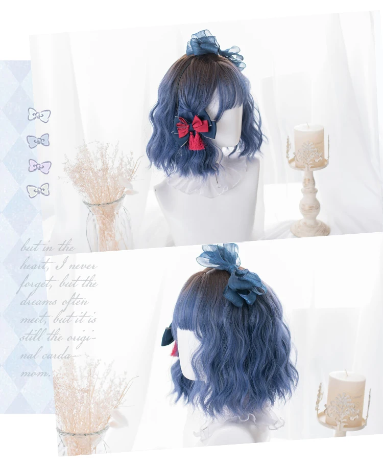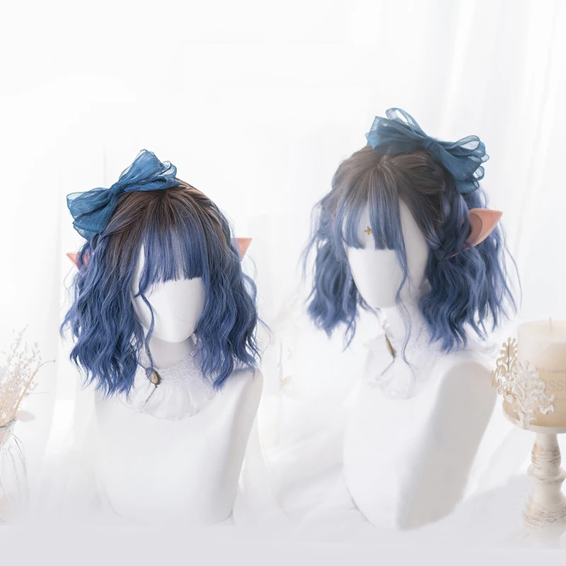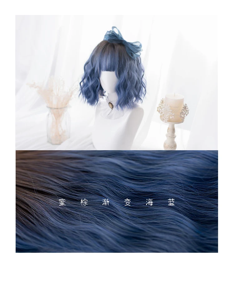 Gradient Ocean Blue Lolita Wig Harajuku Fairy Cosplay Bangs Curly Short Sweet Fringe Synthetic Hair