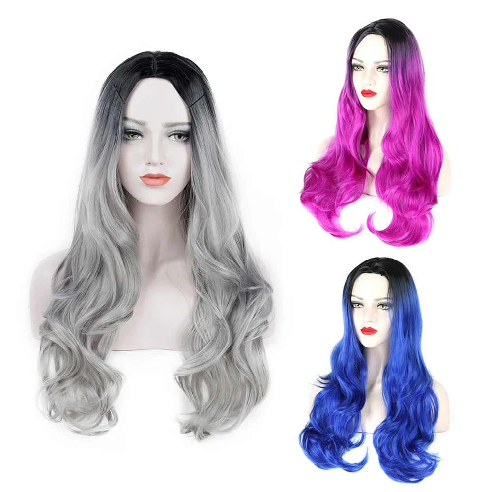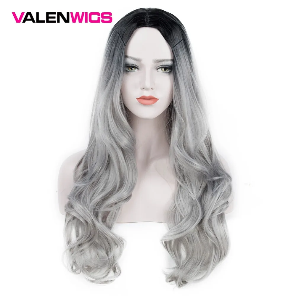 ValenWigs Ombre Wig Two Tones Black To Silver Gray Synthetic Wigs Heat Resistant Glueless Long Wavy