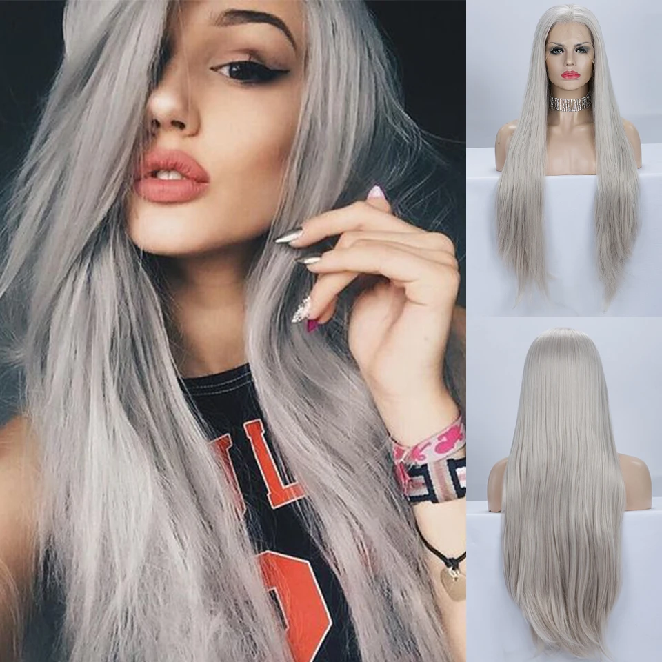 HOT SALE Pinkshow Grey Wig Long Straight Hair Synthetic Lace Front Wig Glueless Heat Resistant Fiber Wigs Fo