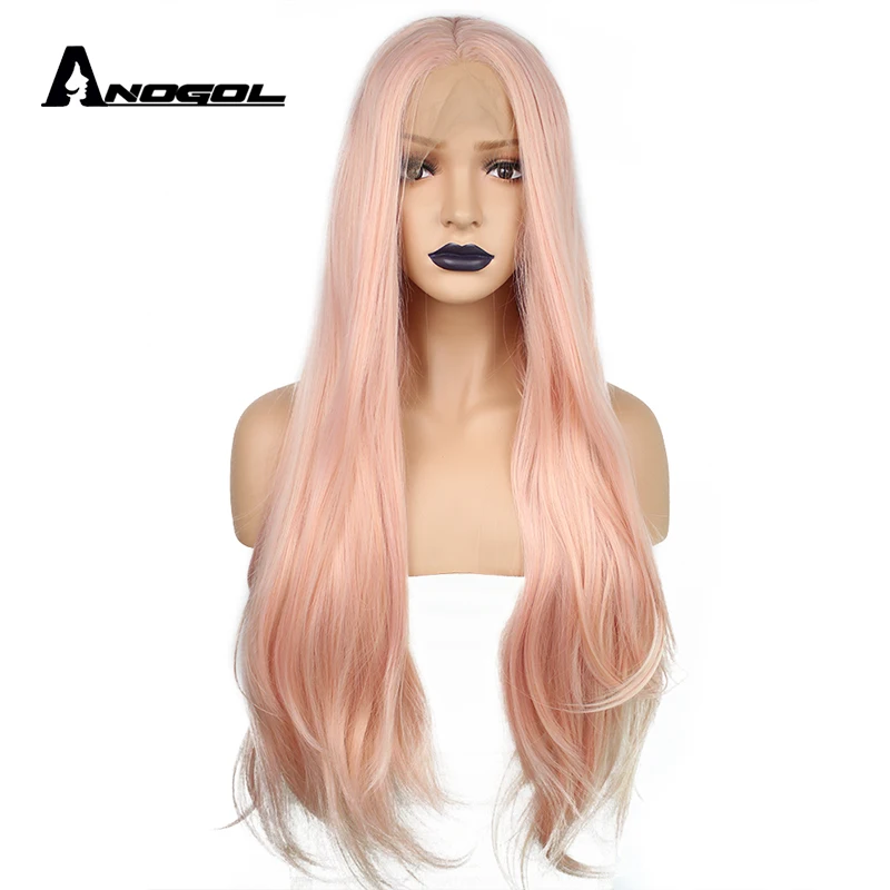 Best Quality Anogol Natural Long Straight Pink Middle Part High Temperature Fiber Heat Resistant Synthetic Lace