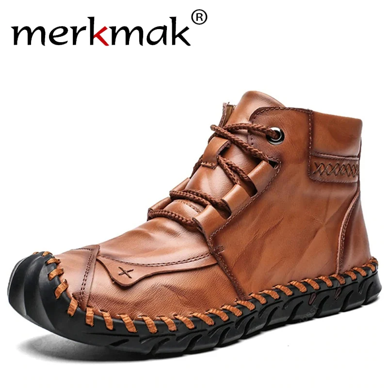 Merkmak High Quality Autumn Winter Men Leather Boots Warm Plush Snow Boots Fashion Lace-up Motorcyc