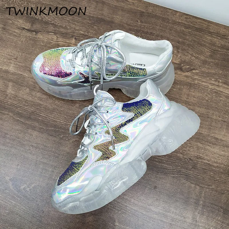Sequined Chunky Sneakers Women Shoes Fluorescent Silver Blue Multicolor Plartfrom Shoes Trainers Ho