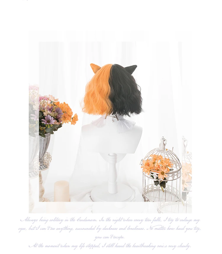 ORIGINAL Harajuku Mixed Black Orange Lolita Wig Horns Short Curly Synthetic Hair Fringe Bangs Adult Girls Ha