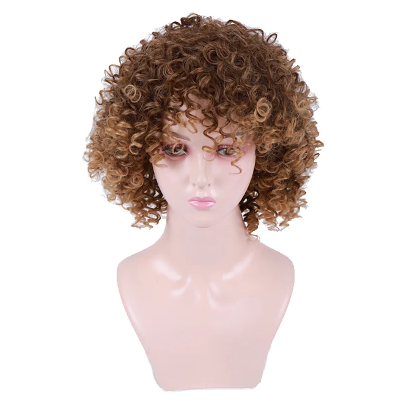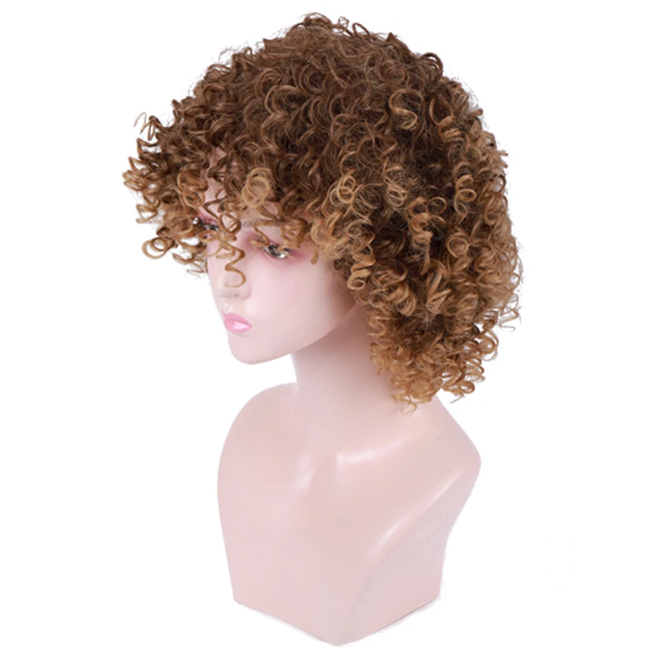 MUMUPI Fashion 12 Inch Synthetic hair wig Brown Hair Afro Kinky Curly Pre Plucked Wig with Bangs fo
