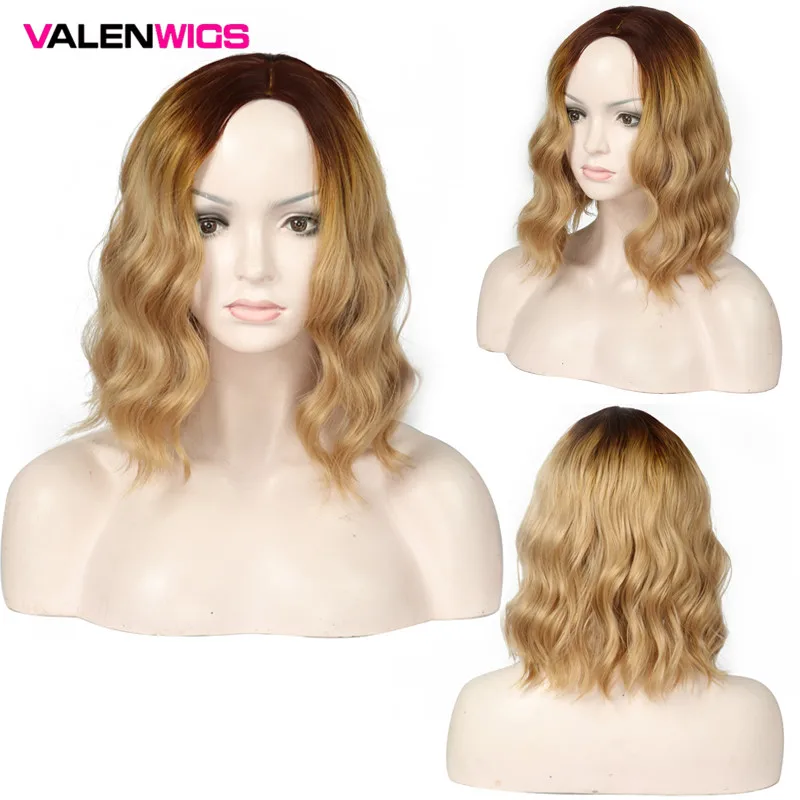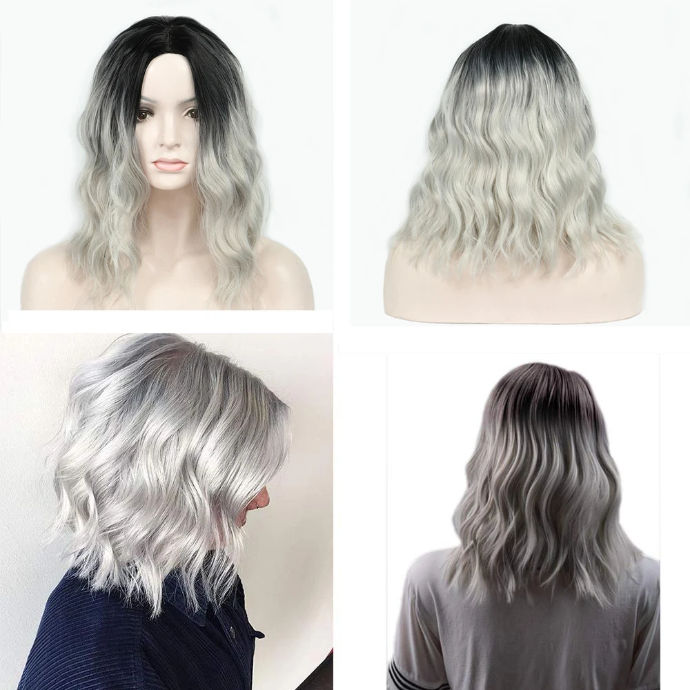 BEST QUALITY ValenWigs 14" Natural Ombre Wig Brown Mixed Blonde/Silver Grey Hair Middle Part Wavy Synthetic Fibe