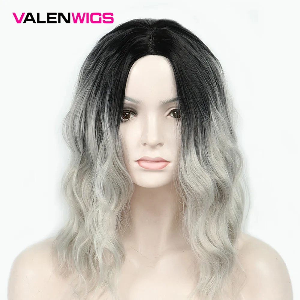 ValenWigs 14" Natural Ombre Wig Brown Mixed Blonde/Silver Grey Hair Middle Part Wavy Synthetic Fibe
