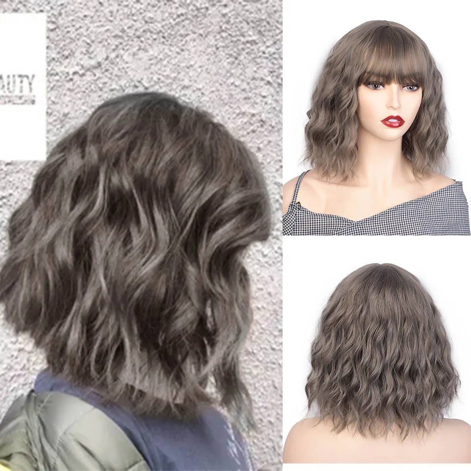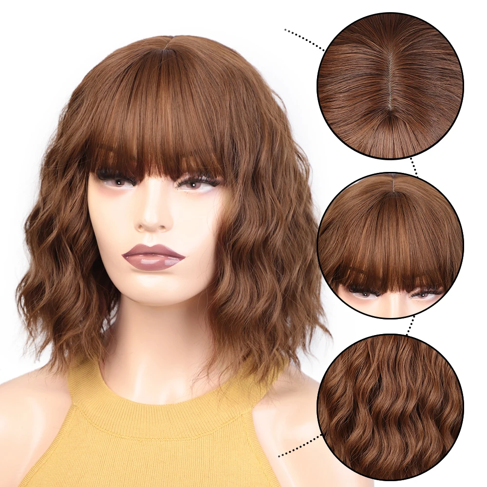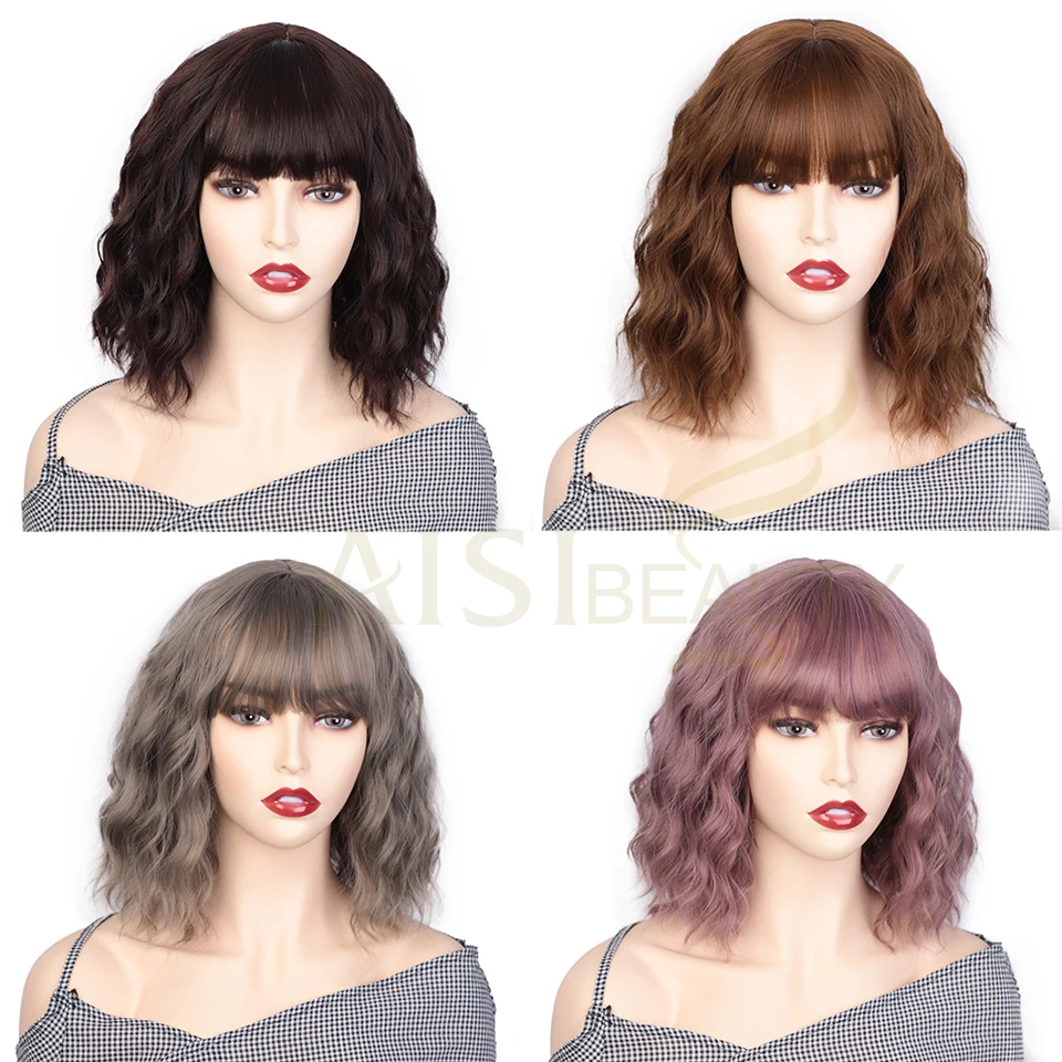 AISI BEAUTY 12''Bob Wig Synthetic Wig Women's Water Wavy Wigs With Bangs Brown Black Purple Natural