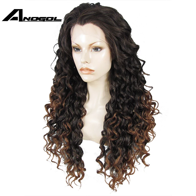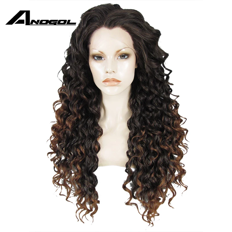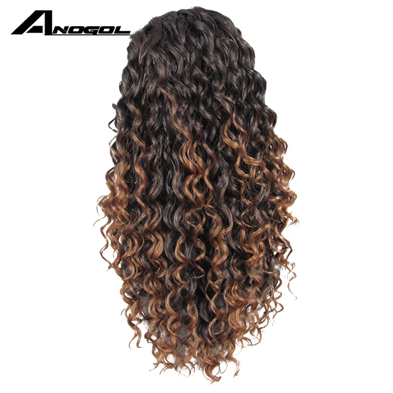 Anogol Heat Resistant Lace Front Wig Brown Ombre Dark Roots Glueless Synthetic Long Kinky Curly Nat